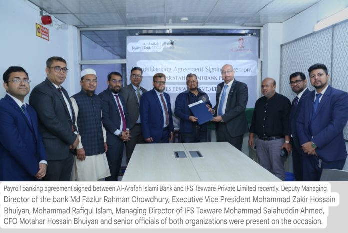 Al-Arafah Islami Bank signed an agreement with IFS Texwear (Pvt.) Limited to provide Payroll Banking Services for the employees of this organization. Deputy Managing Director of the Bank Md. Fazlur Rahman Chowdhury and Managing Director of IFS Texwear Md. Salahuddin Ahmed signed the documents.