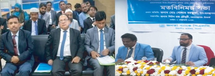 A meeting was recently held at the Sylhet Divisional Office of Janata Bank PLC with all the area heads and branch heads of the division to provide guidance on the current status of the division and to achieve business targets. The meeting was attended by the Deputy Managing Director of the bank, Md. Golam Mortuza, as the chief guest. The meeting, chaired by Liton Roy Chowdhury, General Manager-in-Charge of Sylhet Divisional Office, was attended by the area heads and branch managers of 60 branches.