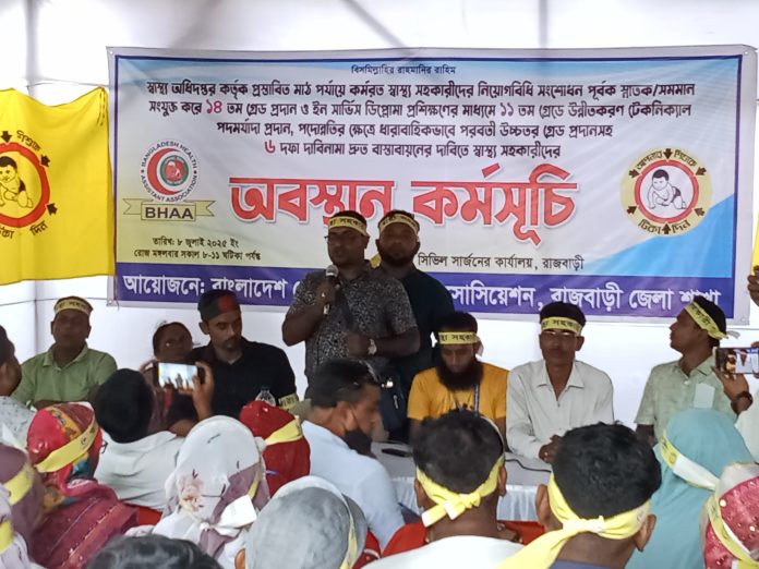 The event was led by Abu Naser Ujjal, President of the Rajbari District Health Assistant Association, with SM Sabuj Shaheen, President and District Spokesperson of the Rajbari Sadar Upazila Health Assistant Association, serving as the main speaker. Other speakers included Dipu Mohan Mondal, President of Pangsha Upazila, General Secretary Ariful Islam, Mashiur Rahman, President of Baliakandi Upazila, Hafiza Sultana, President of Goalanda Upazila, Rajbari Health Assistant Mohammad Ali, Health Assistant Uttam Kumar, Assistant Health Inspector Md. Zillur Rahman, among others.
