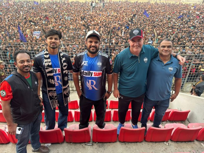 The Raiders landed in Rangpur by helicopter in the afternoon. The team, which won the Global Super League (GSL) title, gave away jerseys to the fans at the beginning. They gave away thousands of jerseys to the people on the field. The people of Rangpur also welcomed the Rangpur Riders cricketers.