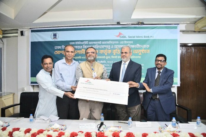 Social Islami Bank PLC (SIBL) Chairman Professor Dr. M. Sadiqul Islam, FCMA handed over a cheque of Tk. 36 lakh to Dhaka University Vice-Chancellor Professor Dr. Niaz Ahmed Khan, PhD, for scholarships dedicated to supporting underprivileged students with special needs. The ceremony, held at the Dhaka University Alumni Association’s Alumni Floor, was attended by key dignitaries, including SIBL’s Acting Managing Director Md. Nazmus Saadat.