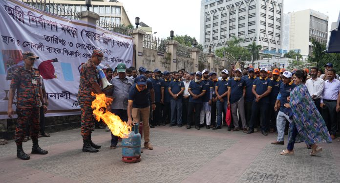 BM Desk: Sonali Bank PLC arranged a fire drill program at its head office in collaboration with the Fire Service Civil Defense on Wednesday. Prior to this, the bank authority arranged a meeting at head office conference room where MD CEO Md. Shawkat Ali Khan attended as chief guest. A team of Fire Service Civil Defense officials shared all types of firefighting techniques in the meeting with the Sonali Bank officials. Later, firefighting team staged a realistic demonstration of firefighting, rescue and emergency evacuation drill in the bank premises.