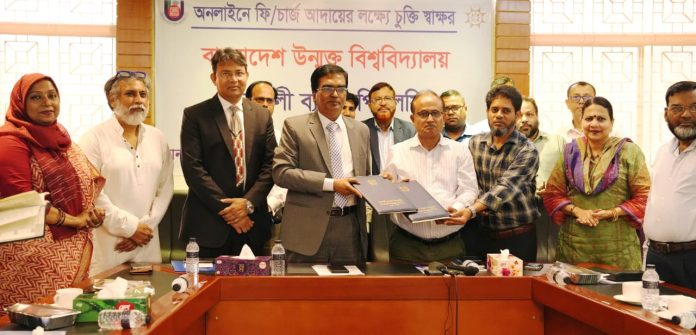 Sonali Bank PLC signed an agreement with Bangladesh Open University (BOU) to collect student’s admission and registration related charges-fees from different programs (Home & Abroad) through the Sonali Payment Gateway. The signing ceremony was held at University main campus conference room in Gazipur on Sunday. Vice Chancellor of BOU Professor Dr. A. B. M. Obaidul Islam and MD & CEO of Sonali Bank PLC, Md. Shawkat Ali Khan exchanged the doccuments after the signing.